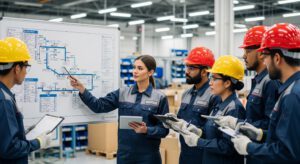 Técnicos ajustando acoplamento entre motor elétrico e redutor industrial, ambos equipamentos rotativos, garantindo alinhamento e eficiência mecânica, mostrando como melhorar o desempenho do motor.