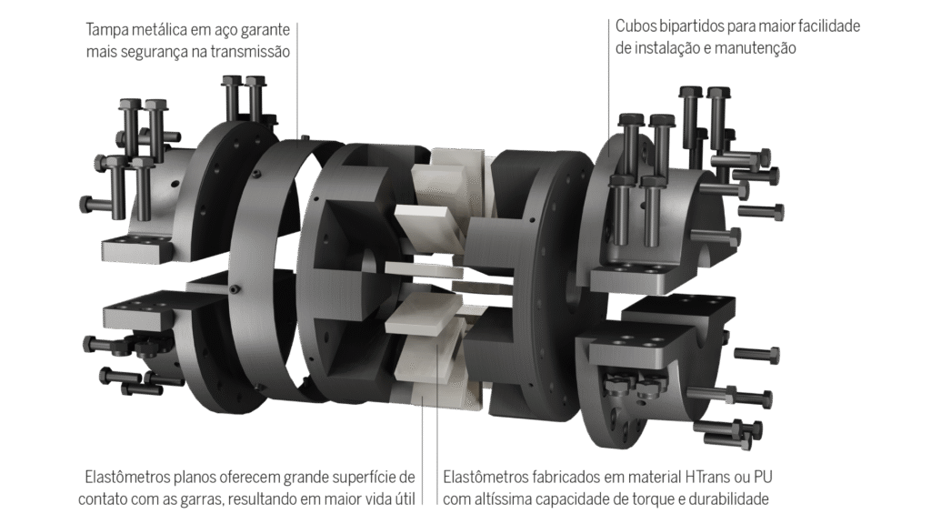 O modelo utiliza elastômeros planos, fabricados em PU ou Htrans, que apresentam excelente área de contato com as garras. Essa característica garante melhor transmissão de torque e reduz o desgaste. Como benefício adicional, aplicações com rotação unidirecional exigem apenas a substituição de metade dos elastômeros. Isso diminui o tempo e o custo das paradas técnicas.