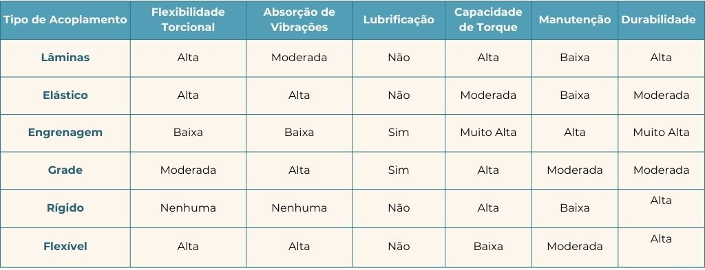 Sendo assim, a escolha entre os diferentes tipos de acoplamentos depende das necessidades específicas de cada aplicação. A excelente combinação de durabilidade, flexibilidade torcional e ausência de necessidade de lubrificação torna os acoplamentos de lâminas ideais para aplicações que exigem operação contínua, como nas indústrias de petróleo e gás, geração de energia e automotiva; enquanto os acoplamentos flexíveis e elásticos geralmente são mais adequados para absorver choques e vibrações.