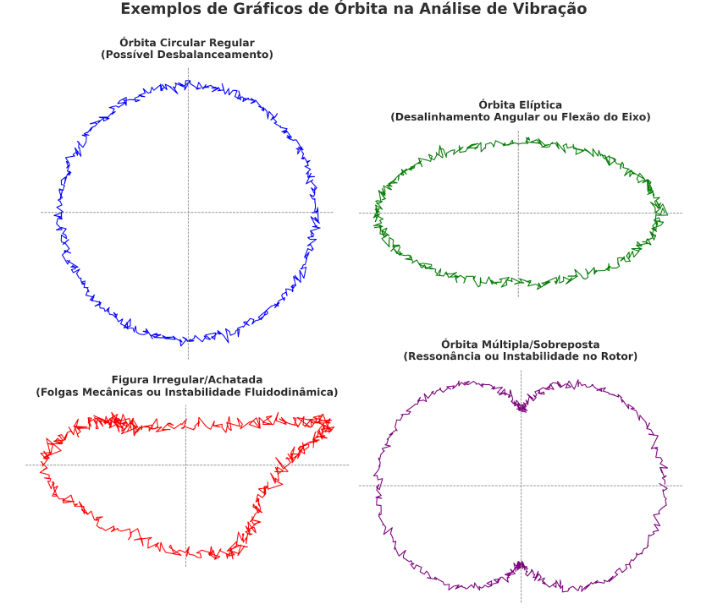 Cada formato de órbita representa um padrão dinâmico específico do eixo e pode indicar, de forma visual, a presença e a natureza de uma falha. Veja a seguir os principais padrões de órbita e seus significados: