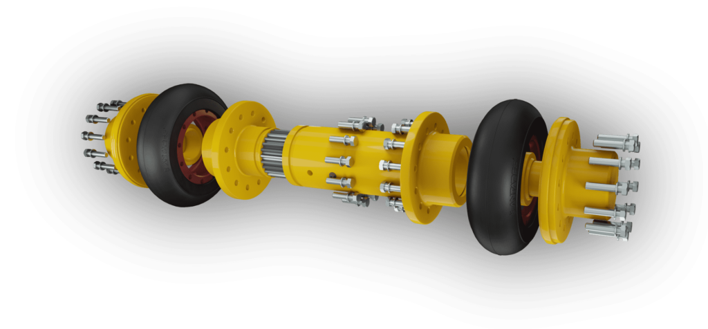 O eixo flutuante conserva as características dos acoplamentos AT, como a alta tolerância ao desalinhamento e a grande capacidade de absorção de choques e vibração.