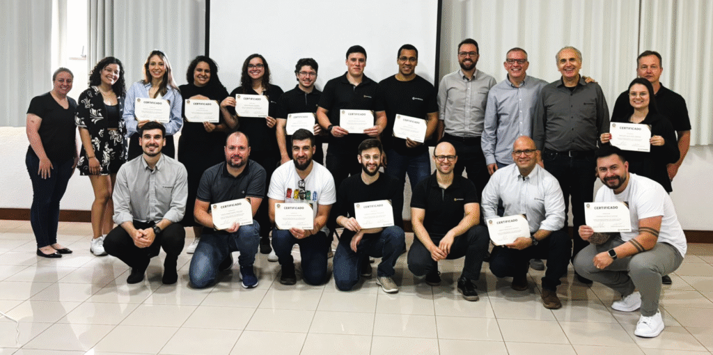 Colaboradores da Antares Acoplamentos posam com certificados após concluírem a Formação de Lideranças LEAN em outubro de 2024.