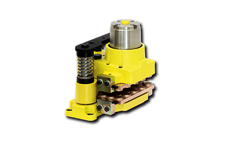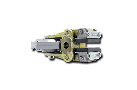 O freio eletro-hidráulico possui uma estrutura de monobloco com dupla sapata, que age com o uso da resistência da sua mola, e possui uma alavanca acoplada ao atuador que executa a liberação ou frenagem da polia.